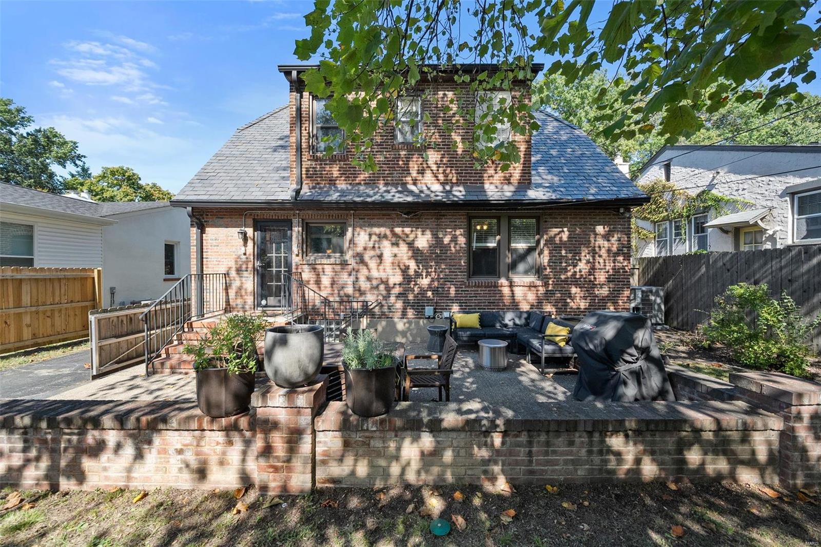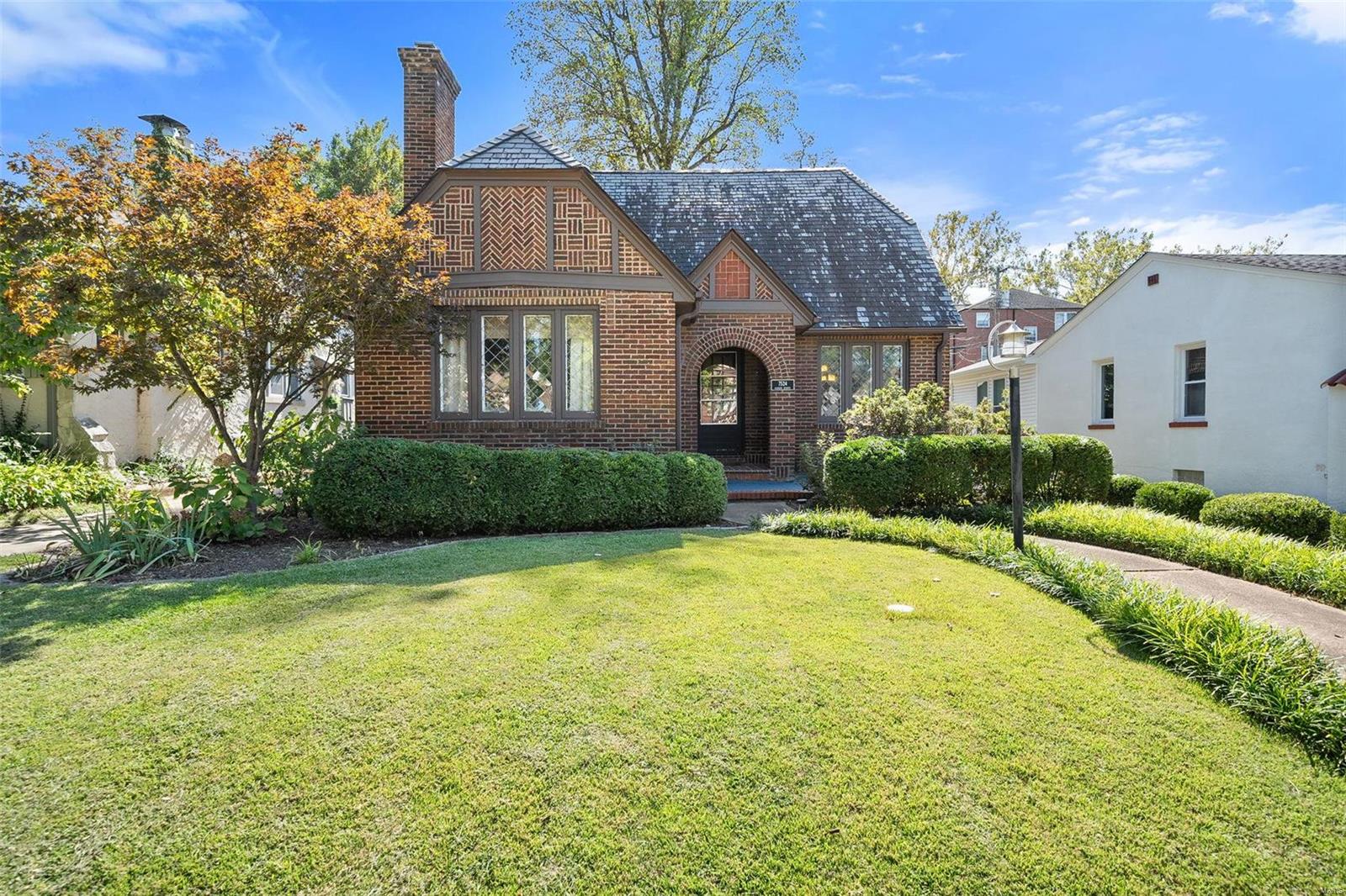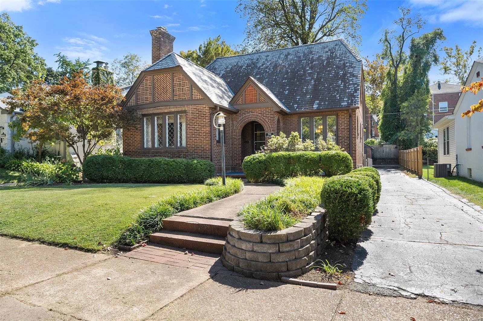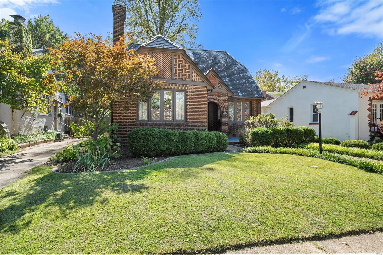 Stunning all brick, 3 bed 2 full bath in fabulous U City location, just a few blocks from Clayton. This charming Tudor offers timeless architectural elements in a modern, flexible layout. Inviting front patio & covered porch lead to lovely foyer. Dramatic, vaulted living room w/ handsome woodburning fireplace. Separate dining room with stained and leaded glass windows. Open kitchen w breakfast bar includes Carrara marble backsplash, SS appliances, ample cabinet storage. Current office, formerly a main floor bedroom, could also function as a family room. Full bath with shower/tub combo complete 1st floor. Both upper level bedrooms includes 2 closets. Full bath includes a generous walk in shower. Full basement with walkout includes a finished laundry area & additional rec space. Lovely aggregate patio, level backyard. Detached 2 car garage. Newer slate roof (less than 20 yrs), drain tile & sump pump, all new sewer lateral, fencing, kitchen appliances.