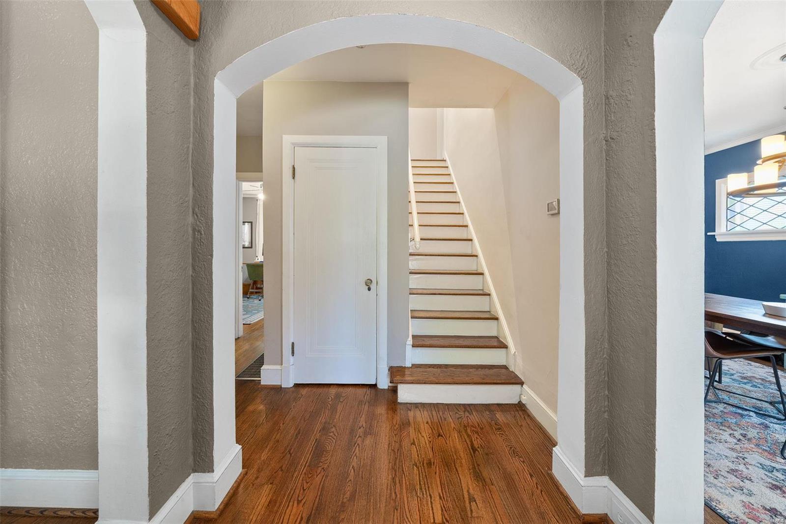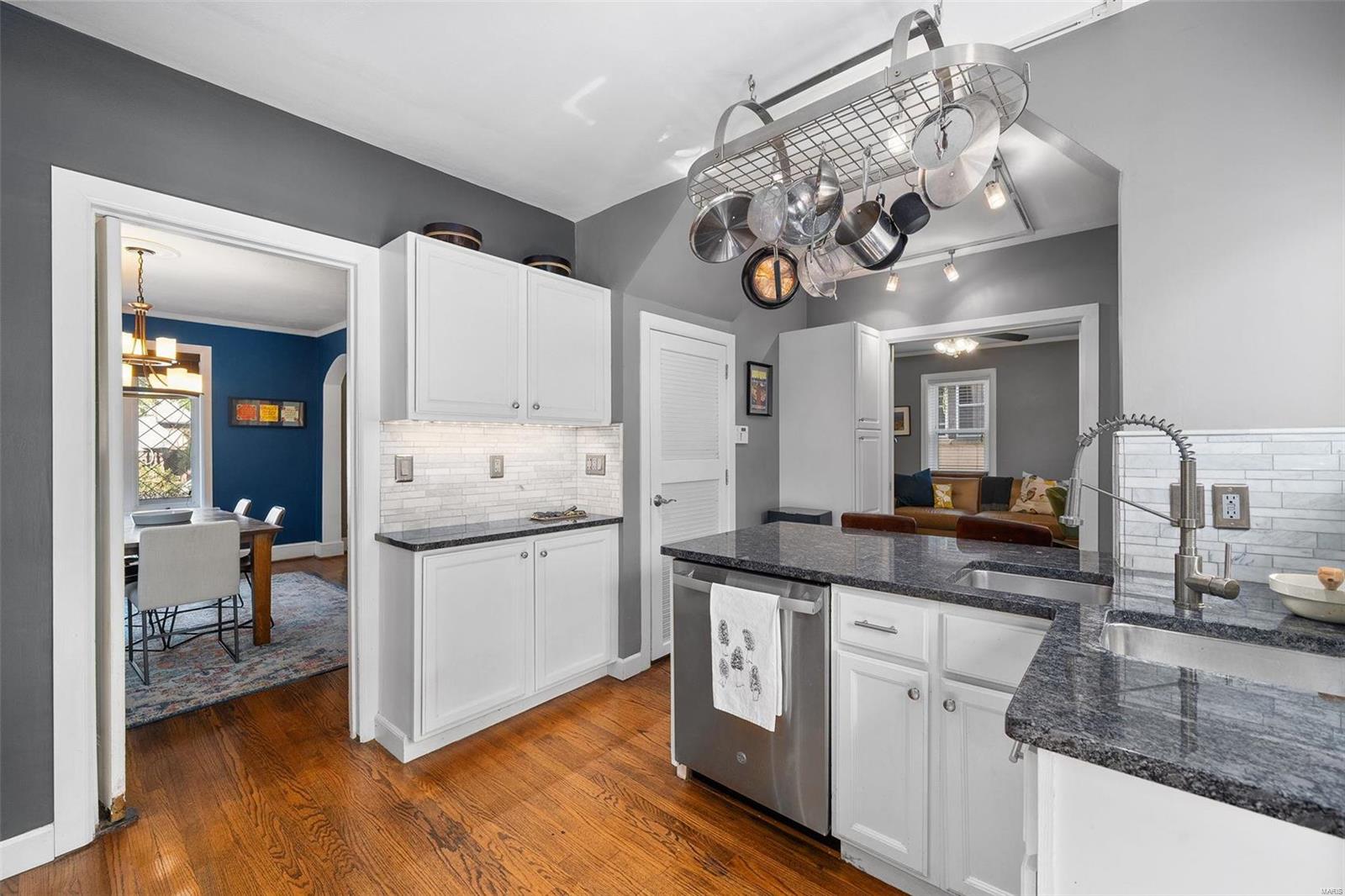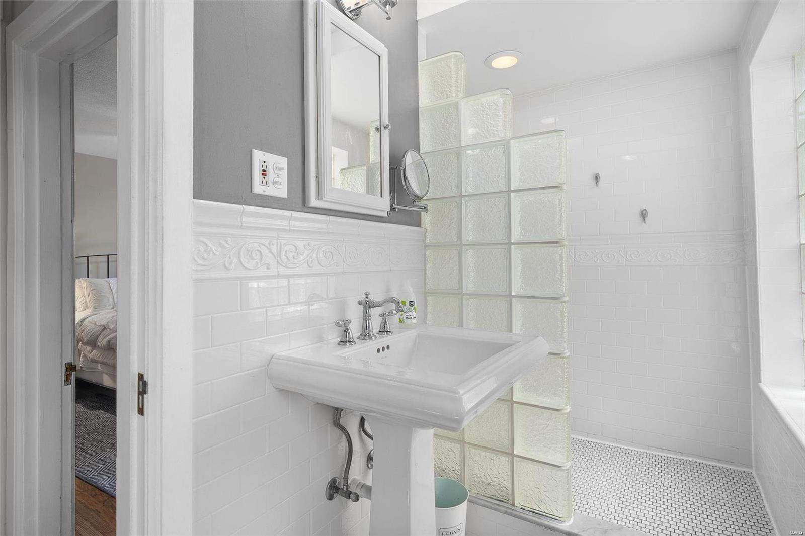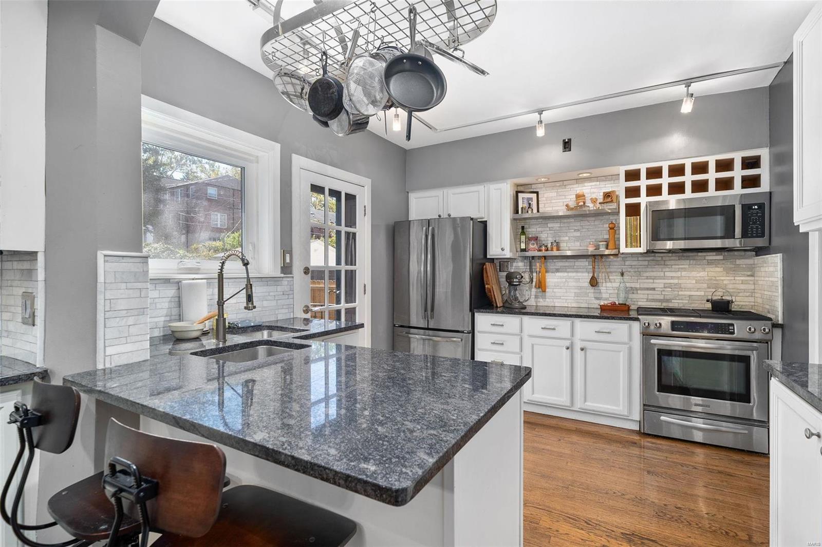 Stunning all brick, 3 bed 2 full bath in fabulous U City location, just a few blocks from Clayton. This charming Tudor offers timeless architectural elements in a modern, flexible layout. Inviting front patio & covered porch lead to lovely foyer. Dramatic, vaulted living room w/ handsome woodburning fireplace. Separate dining room with stained and leaded glass windows. Open kitchen w breakfast bar includes Carrara marble backsplash, SS appliances, ample cabinet storage. Current office, formerly a main floor bedroom, could also function as a family room. Full bath with shower/tub combo complete 1st floor. Both upper level bedrooms includes 2 closets. Full bath includes a generous walk in shower. Full basement with walkout includes a finished laundry area & additional rec space. Lovely aggregate patio, level backyard. Detached 2 car garage. Newer slate roof (less than 20 yrs), drain tile & sump pump, all new sewer lateral, fencing, kitchen appliances.