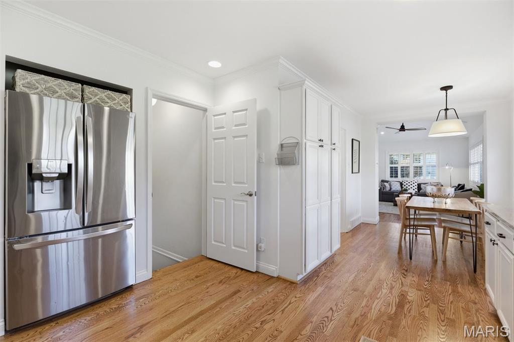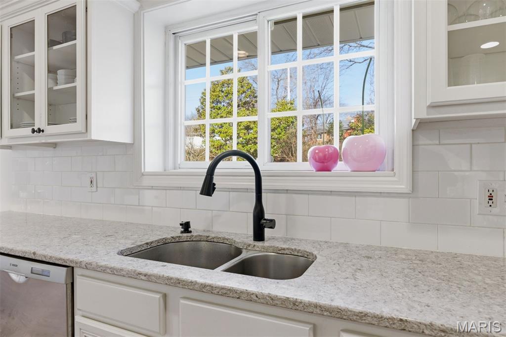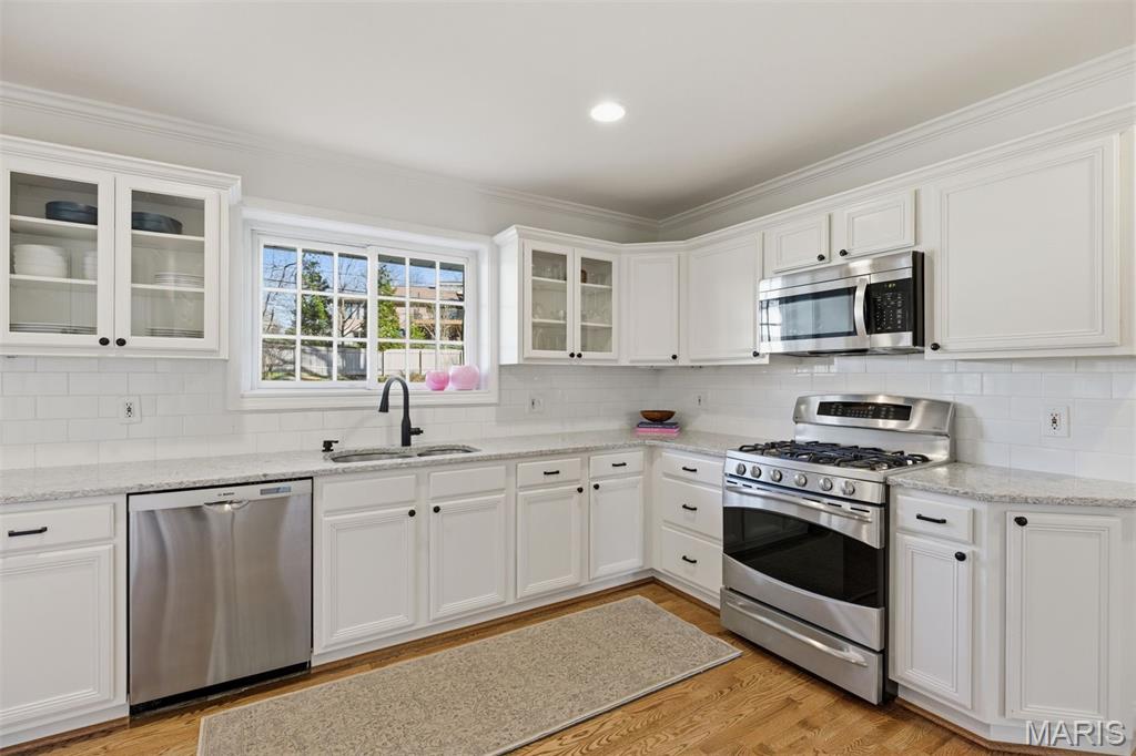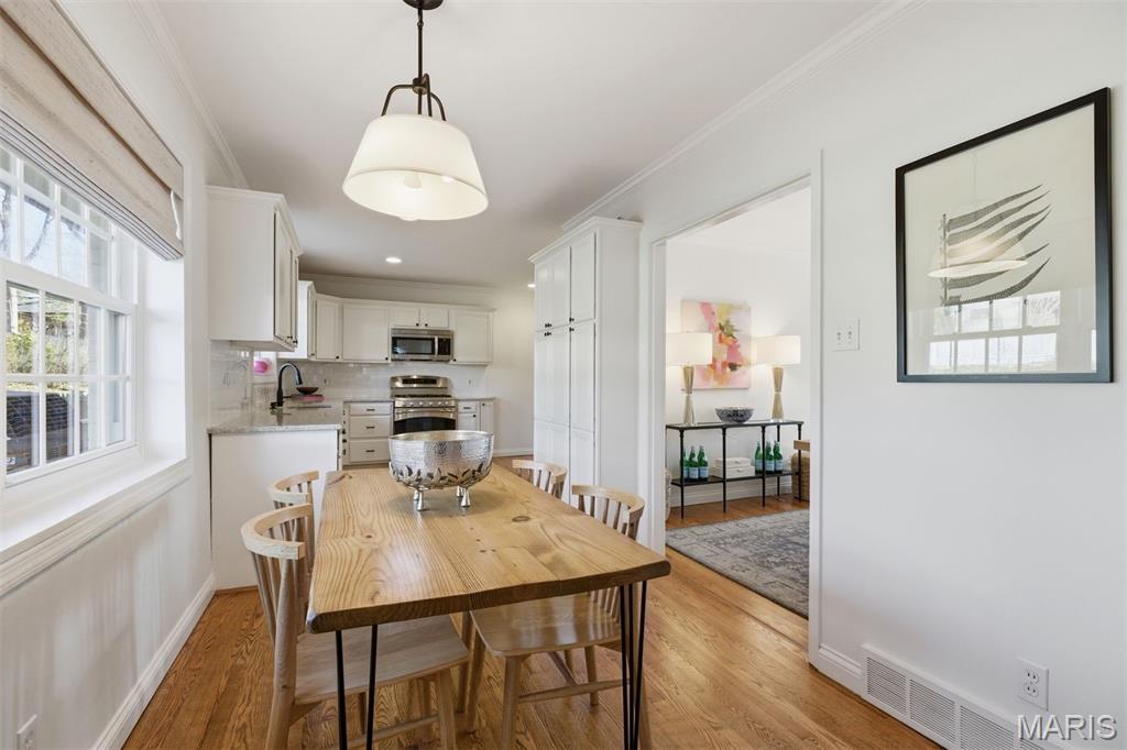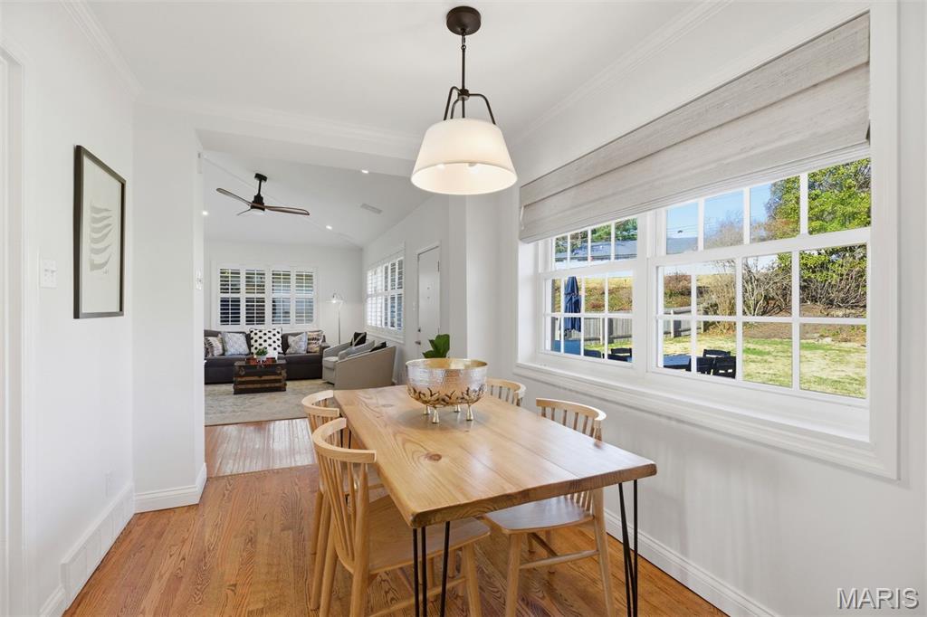 The adjoining dining area flows effortlessly for entertaining, while the bright white kitchen features generous cabinetry, stone countertops, stainless appliances, and a sunny breakfast space overlooking the backyard.
