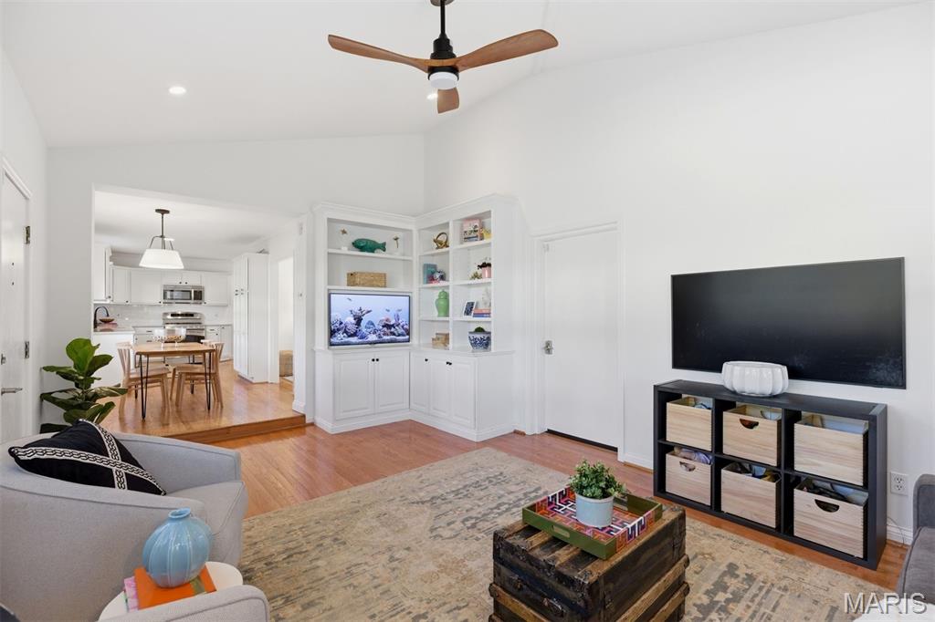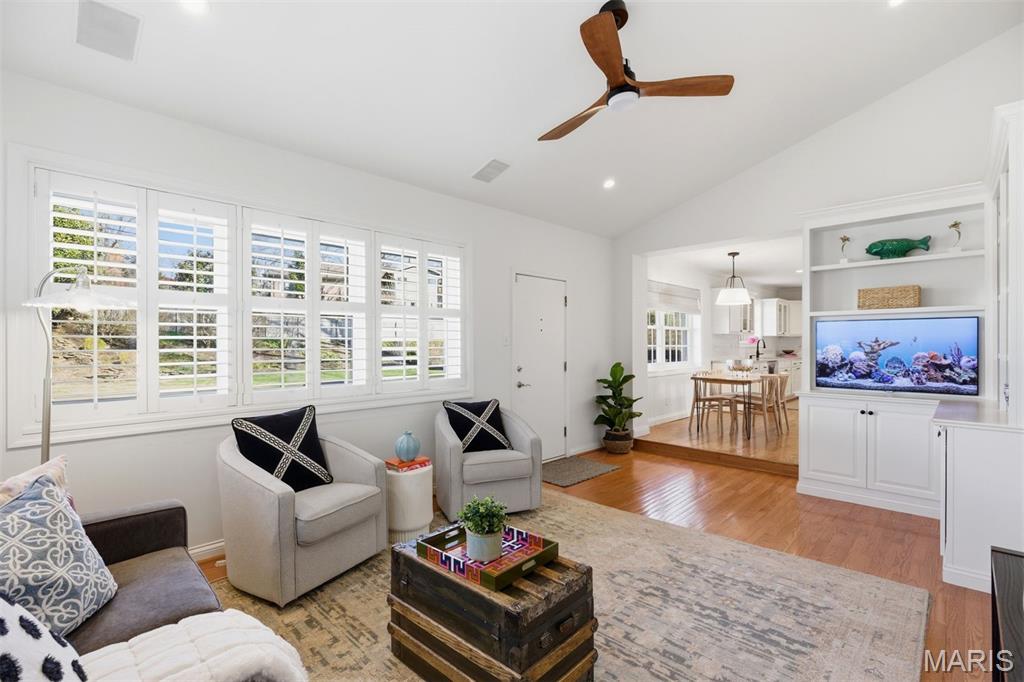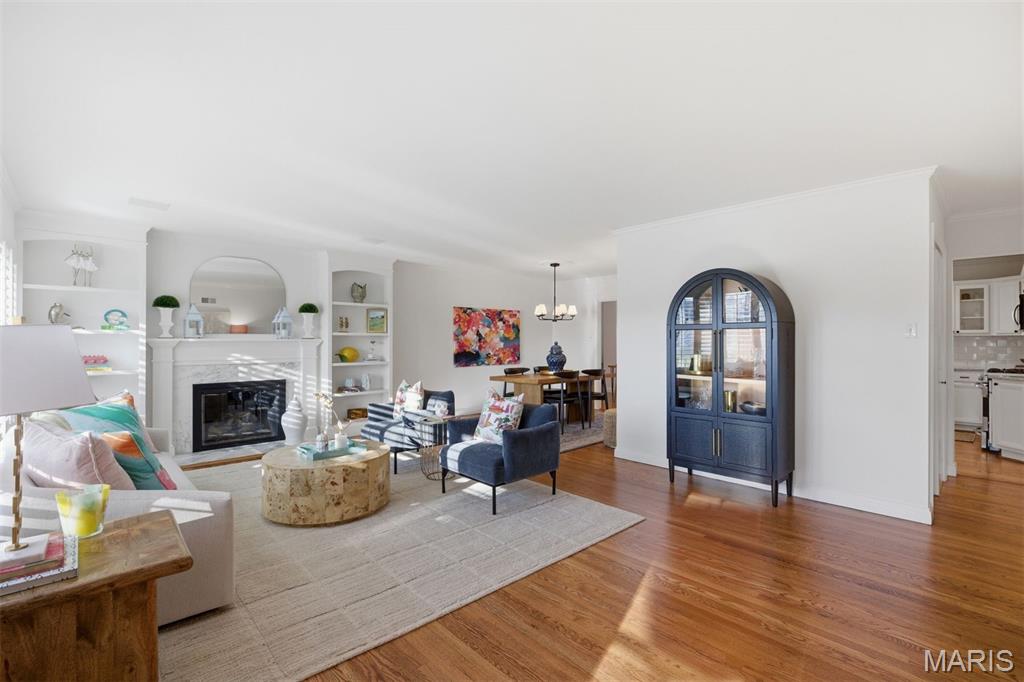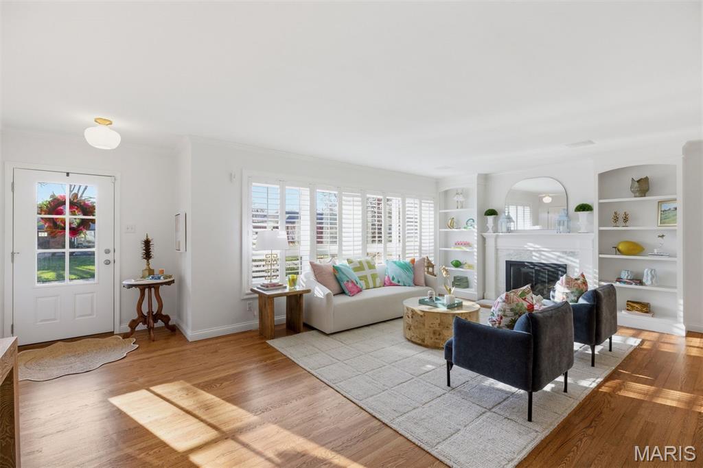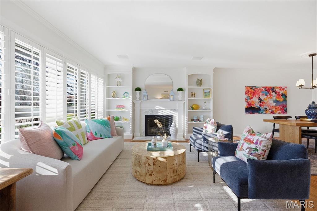 This beautifully refreshed 4-bedroom, 3-bath residence offers an exceptional blend of timeless design and modern comfort. Expansive windows and warm hardwood floors create a bright, airy atmosphere throughout the main living spaces, where the gracious living room centers around a classic fireplace framed by custom built-ins, offering both charm and function.